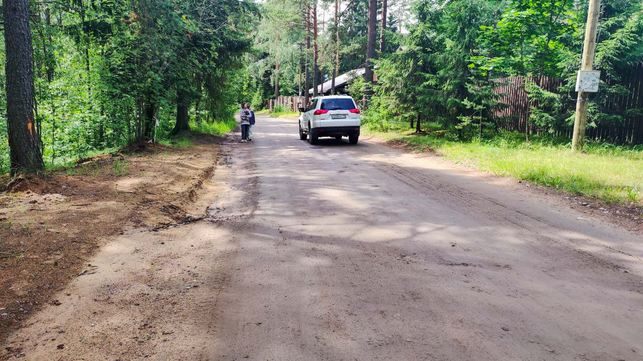 Грунтовая дорога в поселке с зелёными заборами и домами