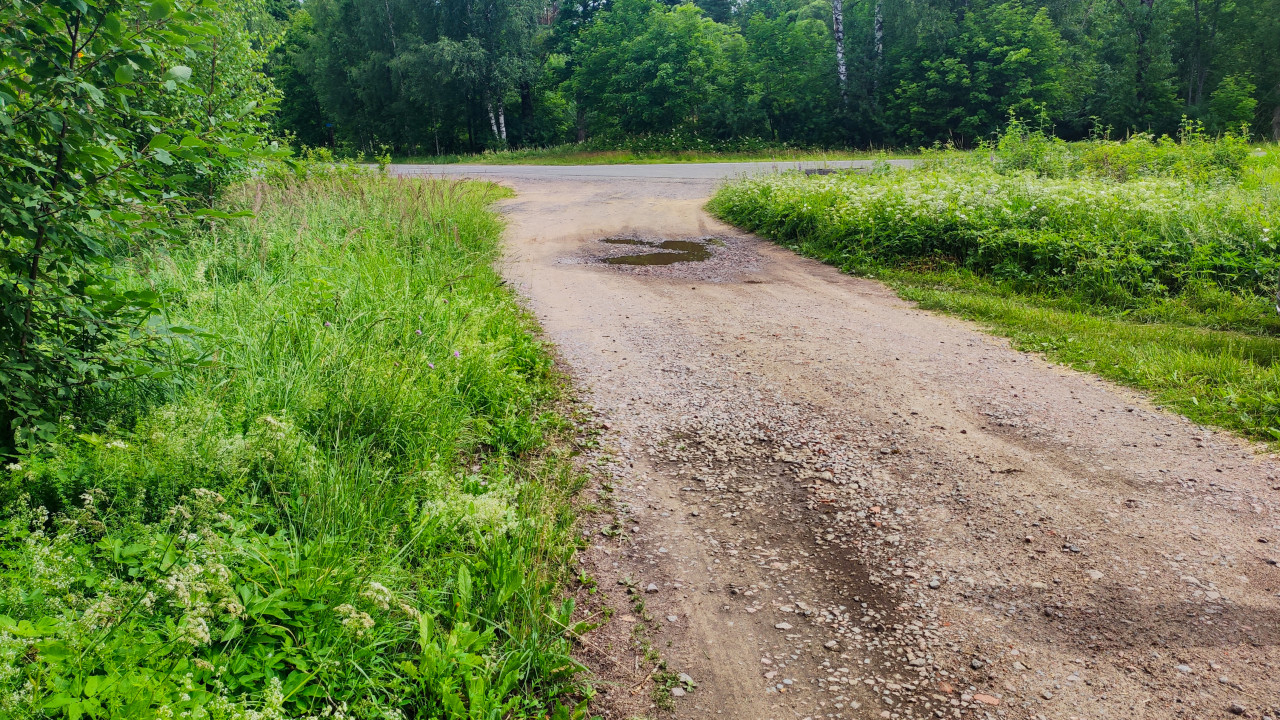 Грунтовая дорога в сельской местности с указателем улицы
