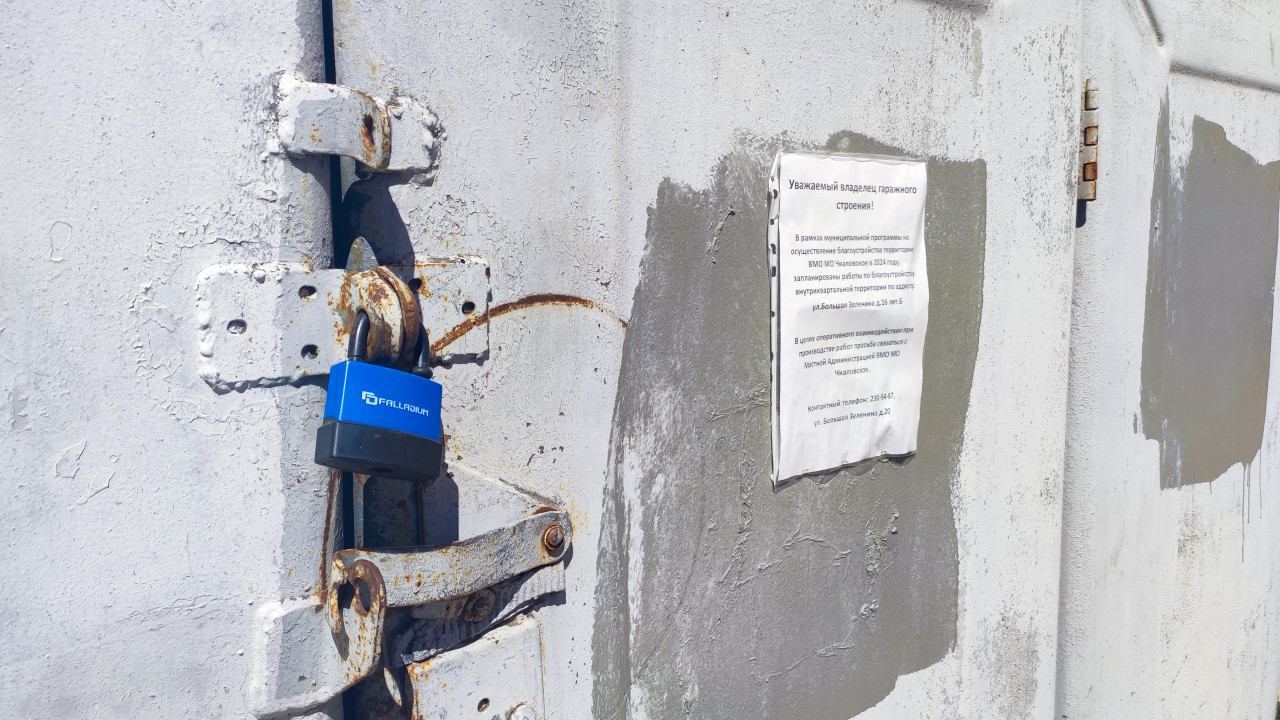 Ржавый запор гаражных ворот с навесным замком FALLADIUM и объявлением о работах