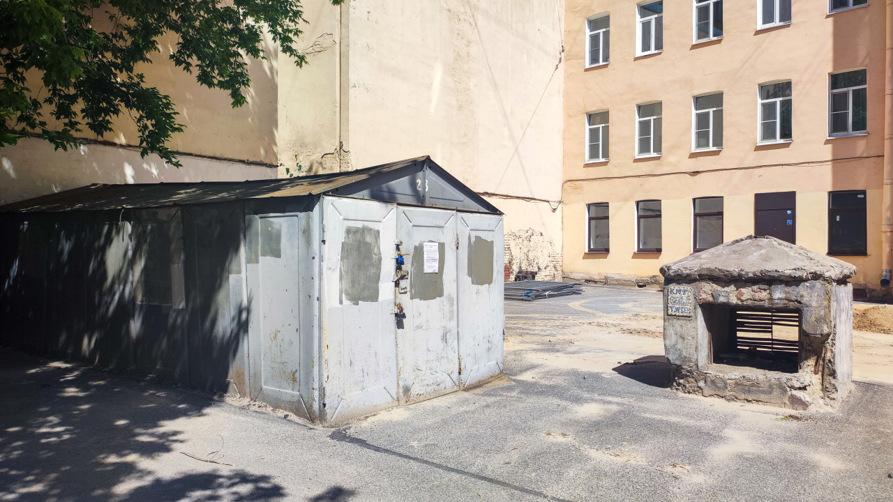 город двор городская среда инфраструктура постройка сооружение гараж металлический гараж бокс номер 23 ворота замок объявление техническое сооружение вентиляция подвала продух решётка инженерные коммуникации фасад здания окна входная дверь асфальт строительная грязь песок тени деревьев лето коммунальные службы обслуживание зданий благоустройство ремонт территории дворовая инфраструктура хозяйственная зона городская недвижимость кварталПохожие фотографии