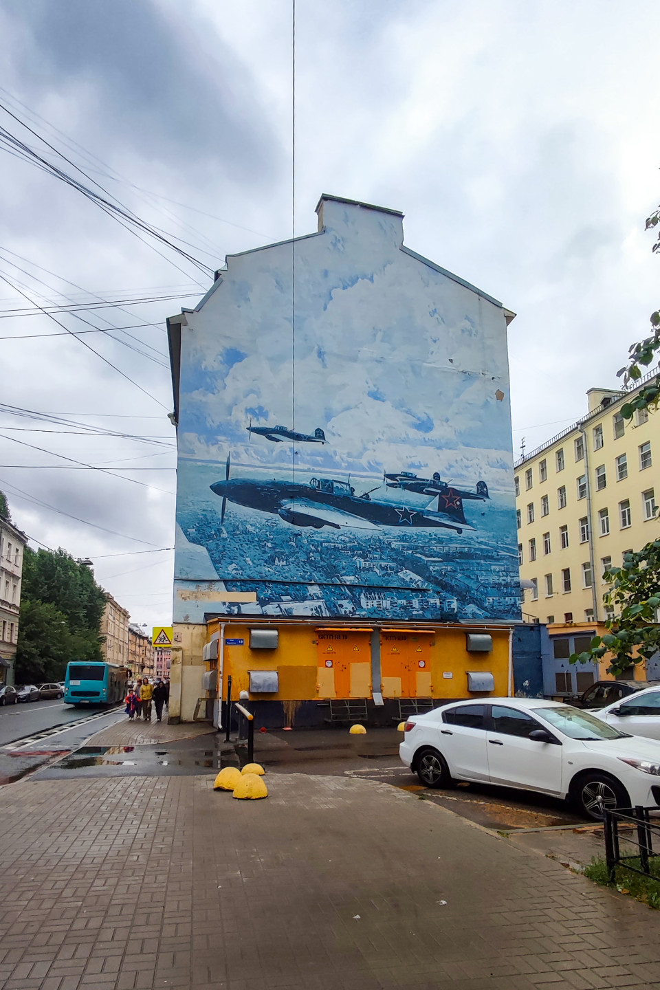 город улица городская среда архитектура фасад здания жилой дом стрит арт мурал граффити настенная роспись самолёт авиация красная звезда облака тротуарПохожие фотографии