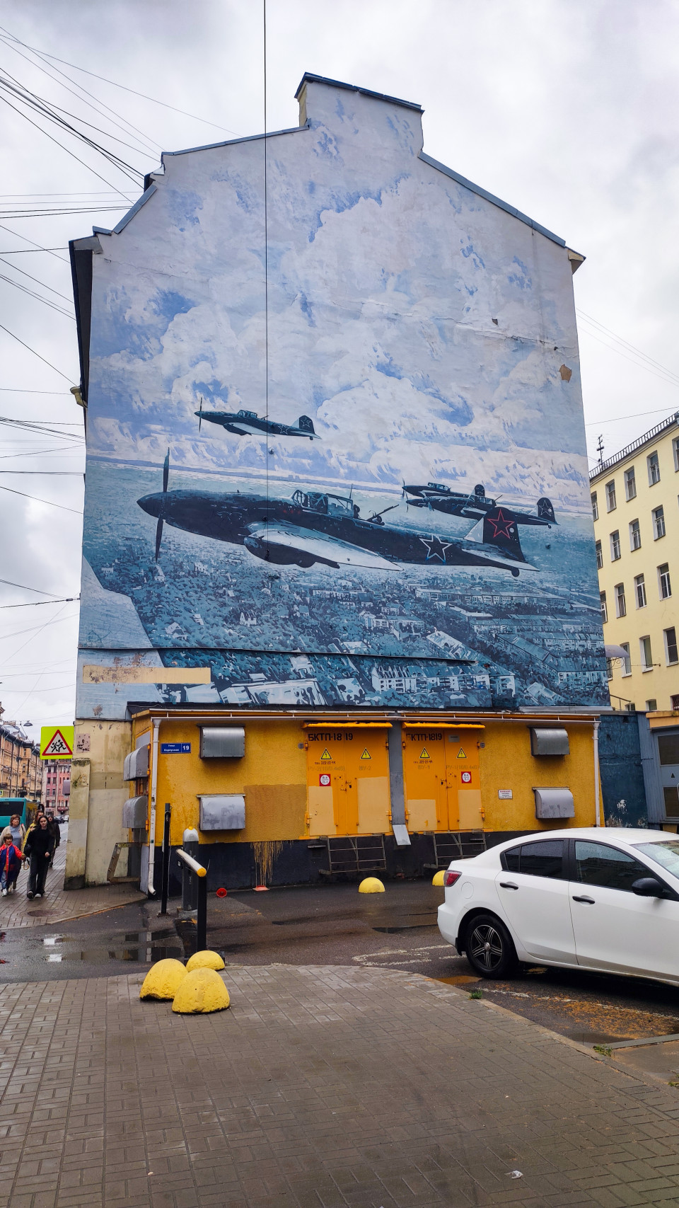 город улица городская среда архитектура фасад здания жилой дом стрит арт мурал граффити настенная роспись самолёт авиация красная звезда облака тротуарПохожие фотографии