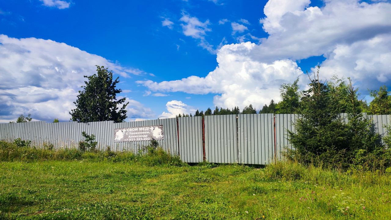 Грунтовая дорога в поселке с зелеными насаждениями и забором