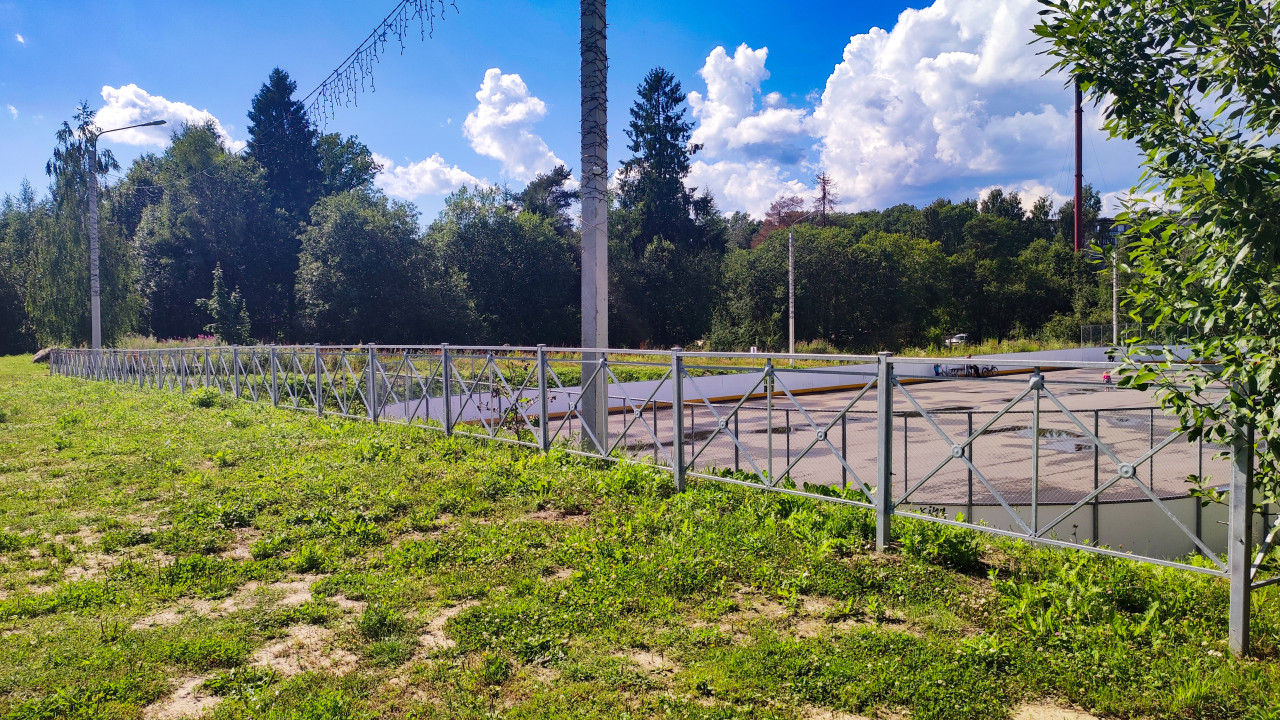 Фрагмент детской площадки с зелёными стойками и ограждением