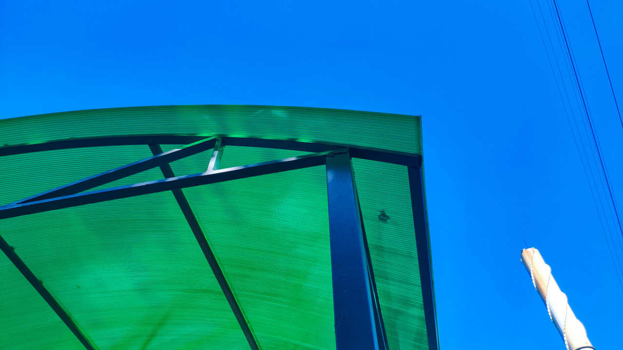 Ряд прямоугольных проёмов на плоской металлической кровле с видом на город