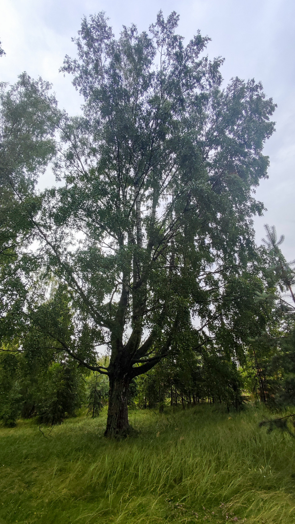 Упавшее сухое дерево и редколесье на болотистой поляне под кучевыми облаками