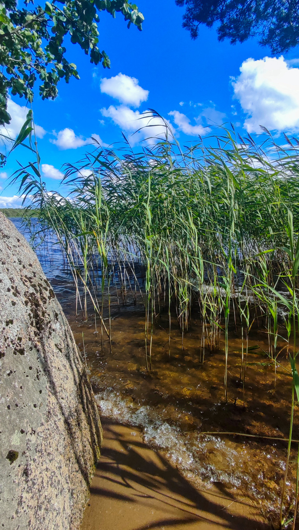 Лесной ручей с папоротниками и корнями деревьев на берегу