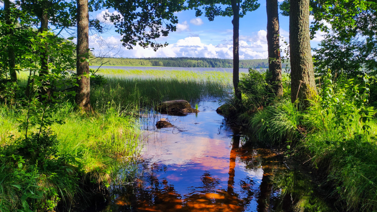 Весенний фрагмент болота с проточной водой и молодой зеленью