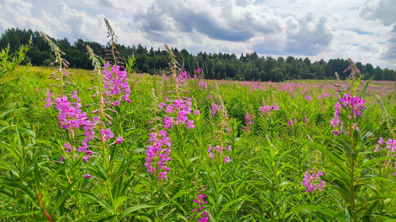 Горный ландшафт с зелеными склонами и цветами в ясный день