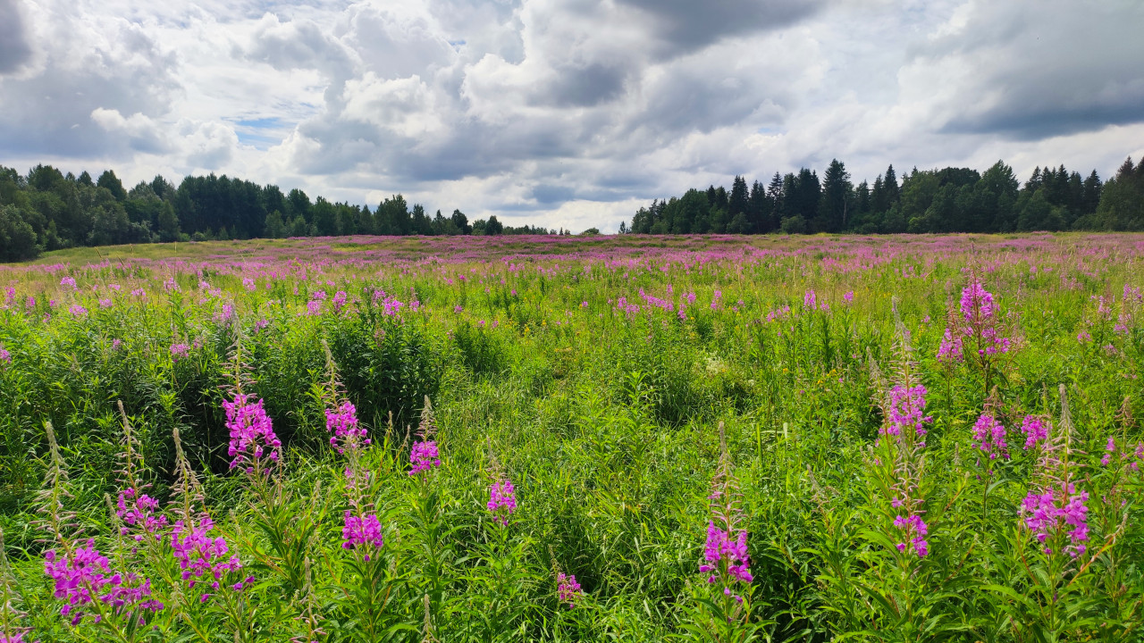 Пейзаж с пустой дорогой между полями под ясным небом