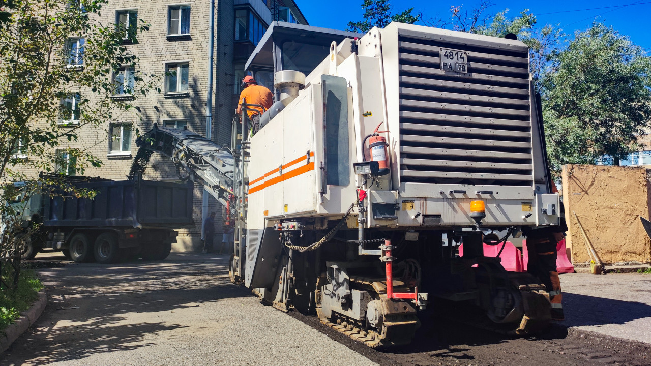 Дорожная фреза с надписью «Fräsen Schneiden Räumen» на фоне многоэтажного жилого дома