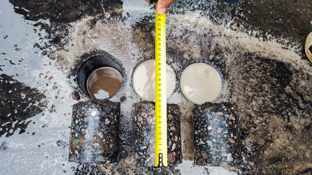 ремонт дорог дорожные работы асфальт асфальтобетон керн отбор проб бурение отверстие в асфальте измерение мокрый асфальтПохожие фотографии