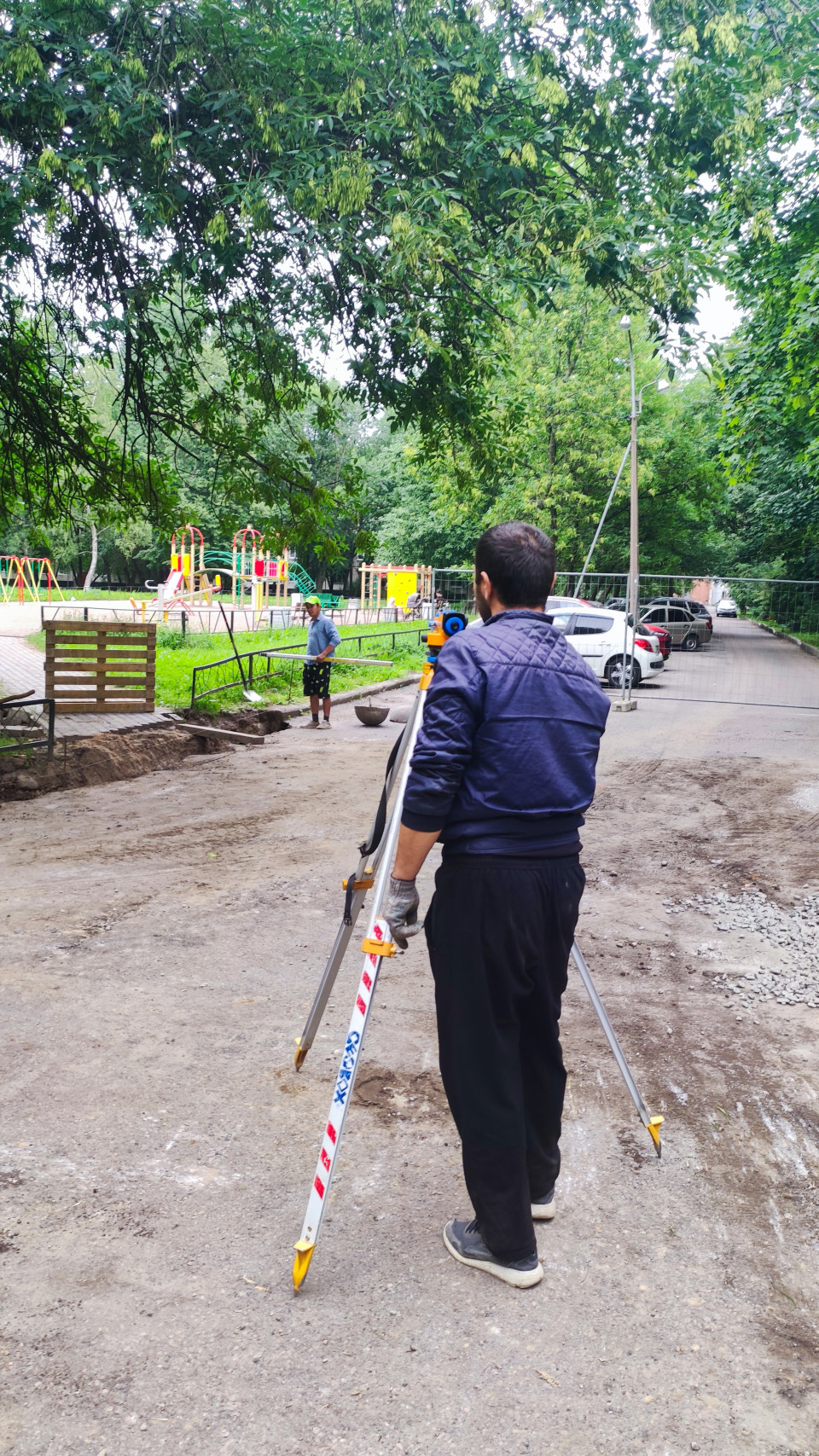 Инженер измеряет глубину выемки дорожного покрытия во дворе