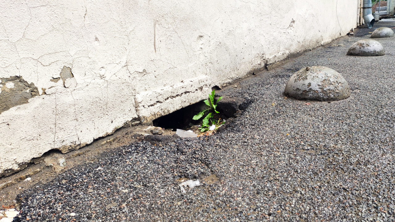 Санкт-Петербург, улица Большая Зеленина. Крупный план участка у основания фасада: по нижнему краю стены тянется трещиноватая штукатурка с потёртостями, а под ней видна глубокая ниша, заполненная мусором и влажным грунтом. Из отверстия пробивается зелёное растение, контрастируя с серым зернистым асфальтом. Вдоль проезда стоят бетонные полусферы, ограничивающие парковку, в перспективе виден водосток и продолжение фасада. Фото подходит для тем о состоянии городских зданий, ремонте цоколей, водоотведении и дворовой инфраструктуре.