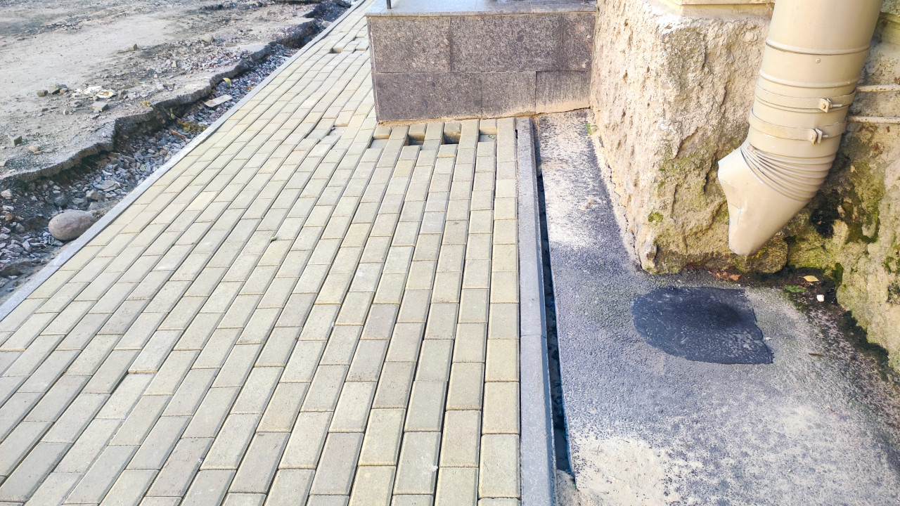 дефекты разрушение город тротуарная плитка мощение дефект просадка пустоты повреждение покрытия ремонт тротуара качество работ строительные ошибки отмостка бордюр водосток водосточная труба дренаж фундамент цоколь каменная стена следы влаги пятно щебень грунт благоустройство строительство городская инфраструктура коммунальные службы обследование технический контрольПохожие фотографии