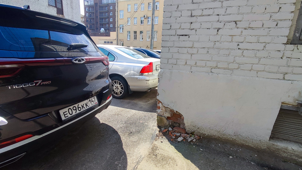 дефекты разрушение двор парковка автомобиль кроссовер Chery TIGGO7 PRO задняя часть авто номерной знак кирпичная стена белый кирпич угол здания цоколь штукатурка сколы повреждение фасада оголённая кладка строительный мусор городская среда внутриквартальная территория тесный проезд эксплуатация здания обслуживание домов ЖКХ солнце тень транспорт городской двор ремонт дефекты отделки инфраструктураПохожие фотографии