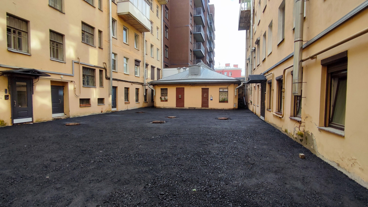 Щебёночный двор с входом под козырьком и окнами в решётках на первом этаже