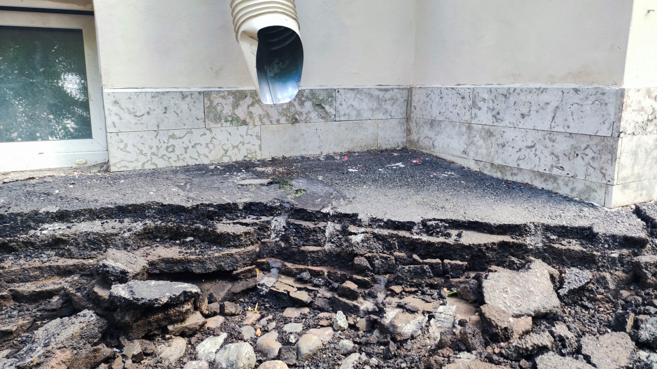 Измерение высоты кромки асфальта у фасада здания