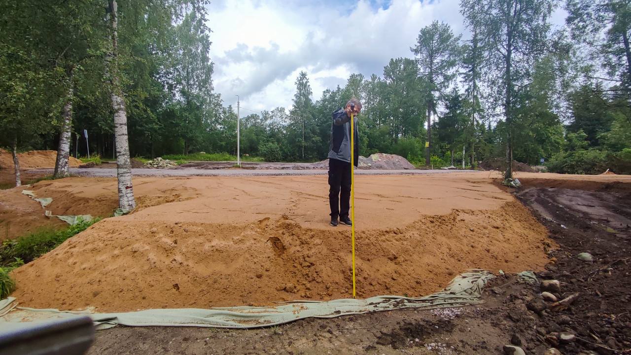 Измерение неровностей резинового покрытия детской площадки в летний день