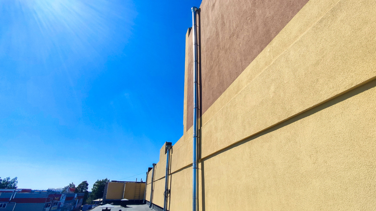 Плоская кровля с вентиляционными выходами и разобранными элементами строительных лесов