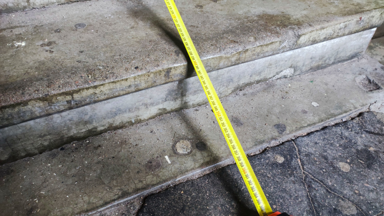 Замер расстояния от щебня до кромки асфальта с использованием уровня