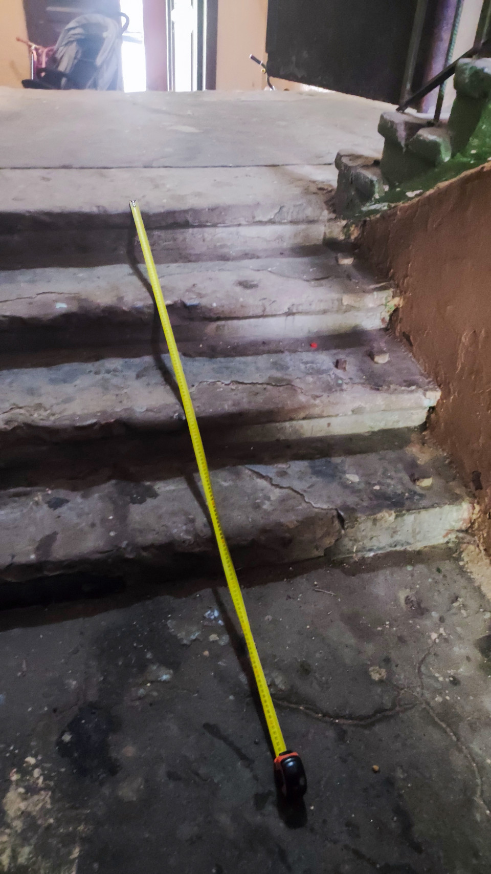 Вертикальный замер высоты у металлической площадки на фоне строительных материалов