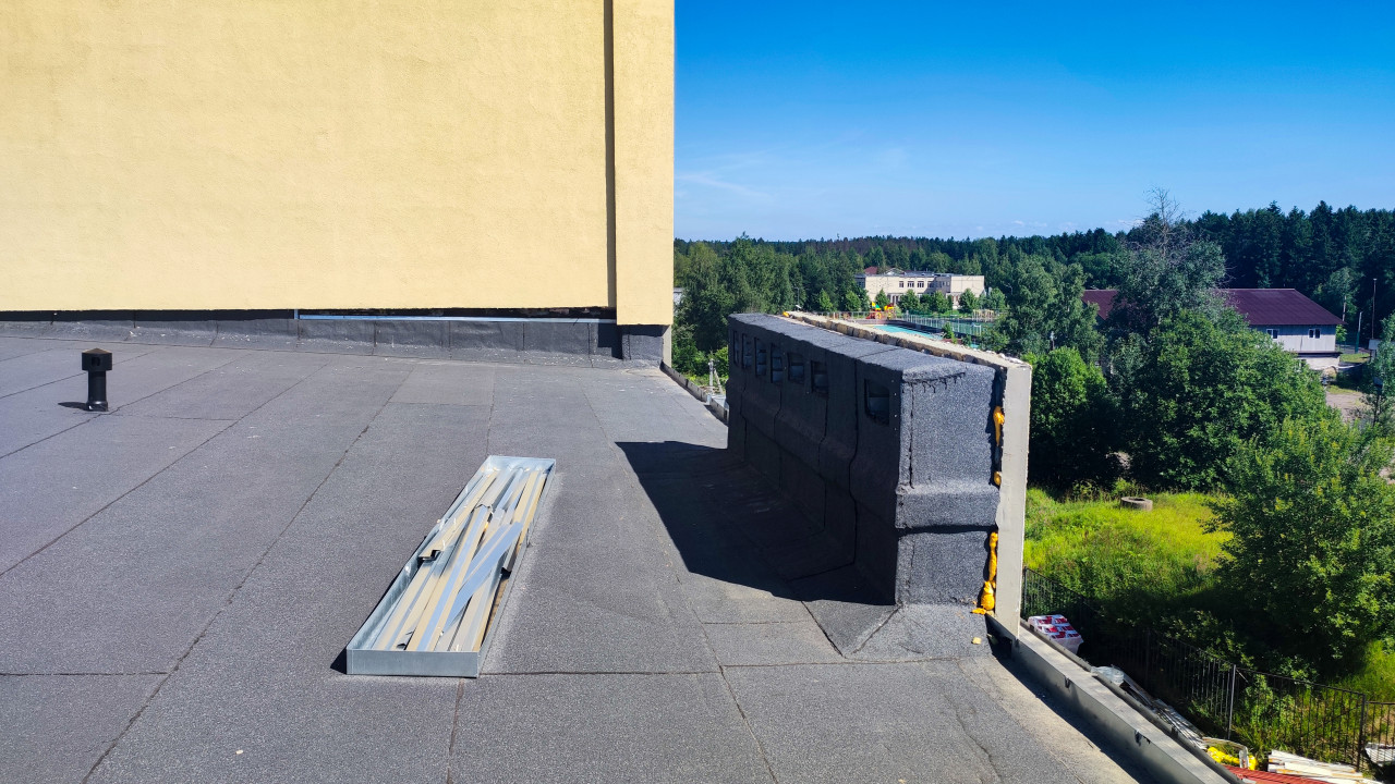 Плоская кровля с демонтированными металлическими планками и парапетом на этапе ремонта