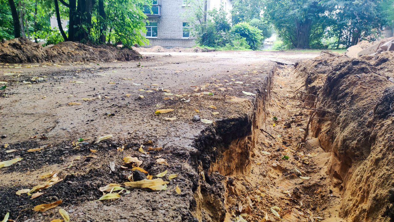 Замер глубины раскопа рулеткой на участке ремонта дорожки