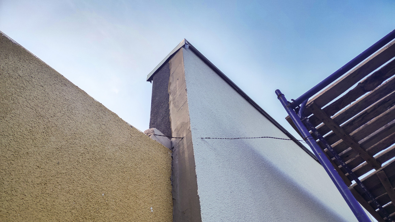 На фотографии показан угол здания крупным планом: два фасада разного цвета сходятся в вертикальном шве, сверху установлен металлический колпак и планка примыкания по кромке кровли. Видны следы ремонтных работ и разные фактуры штукатурного покрытия, а также защитная накладка на ребре. Справа в кадр попадает часть синих строительных лесов и деревянного настила, что указывает на проведение высотных работ. Композиция подчёркивает детали стыка материалов и герметизацию узлов на фасаде. Подходит для материалов о строительных узлах, ремонте кровли и фасадных примыканиях.