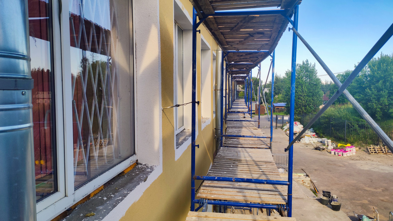 строительство ремонт реконструкция капитальный ремонт здание фасад ремонт зданий строительные работы наружные работы строительные леса ремонт фасада высотные работы настил деревянные доски металлический каркас окна решётка на окне откосы штукатурка окраска фасада жёлтый фасад белый фасад вентиляционная труба строительная площадка материалы ведра краска инструмент ограждение безопасность организация работ реконструкция здания подрядчик обслуживание здания промышленное здание перспективa рабочий проход монтажПохожие фотографии