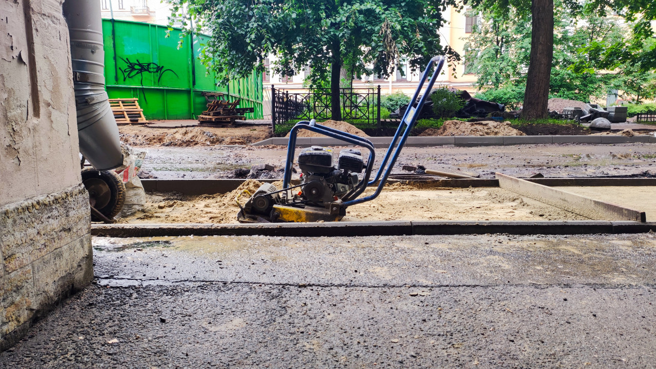 благоустройство ремонт дорожные работы строительство стройплощадка уплотнение виброплита трамбовка основаниеПохожие фотографии