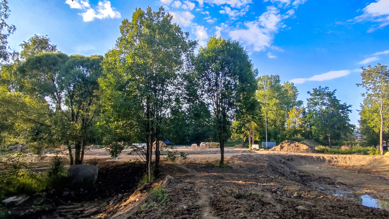 Складирование труб теплотрассы на плите перед монтажом котельной