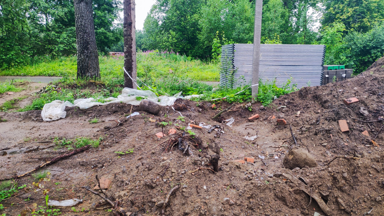 Выемка грунта вдоль зелёной зоны для ремонта дорожки