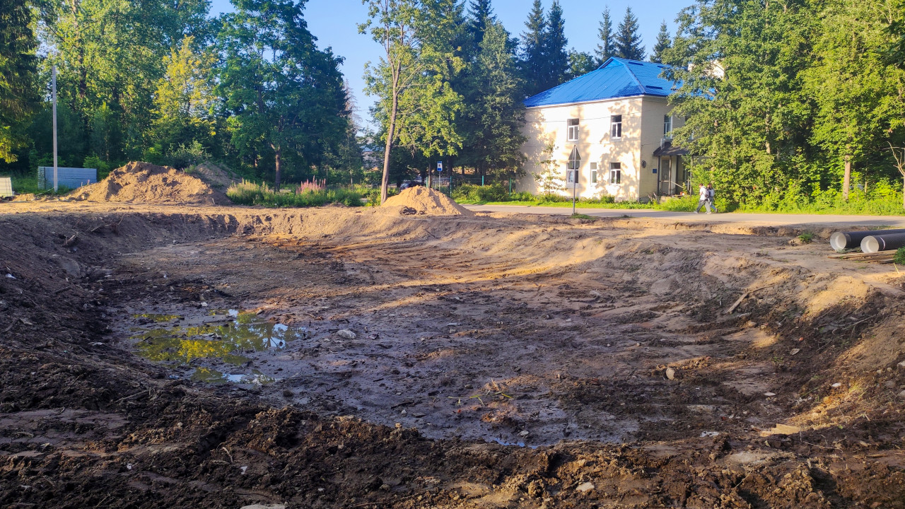 Асфальтированная площадка возле современного здания после дождя