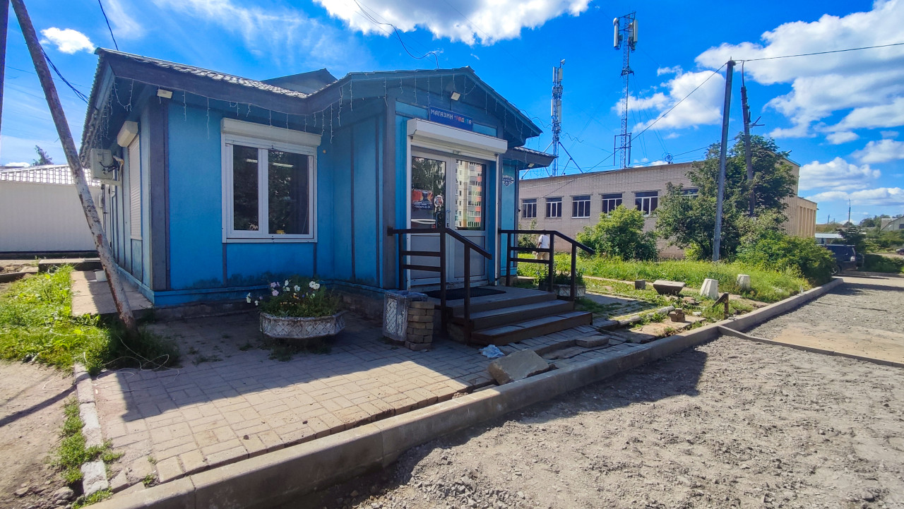 магазин торговый павильон киоск павильон малый бизнес торговля вход крыльцо ступени пандус перила тротуарная плитка вывеска витрина окно рольставни городская среда жилой район придомовая территория благоустройство уличная торговля инфраструктура мачта связи антенны провода кусты цветник летний день общественное пространствоПохожие фотографии