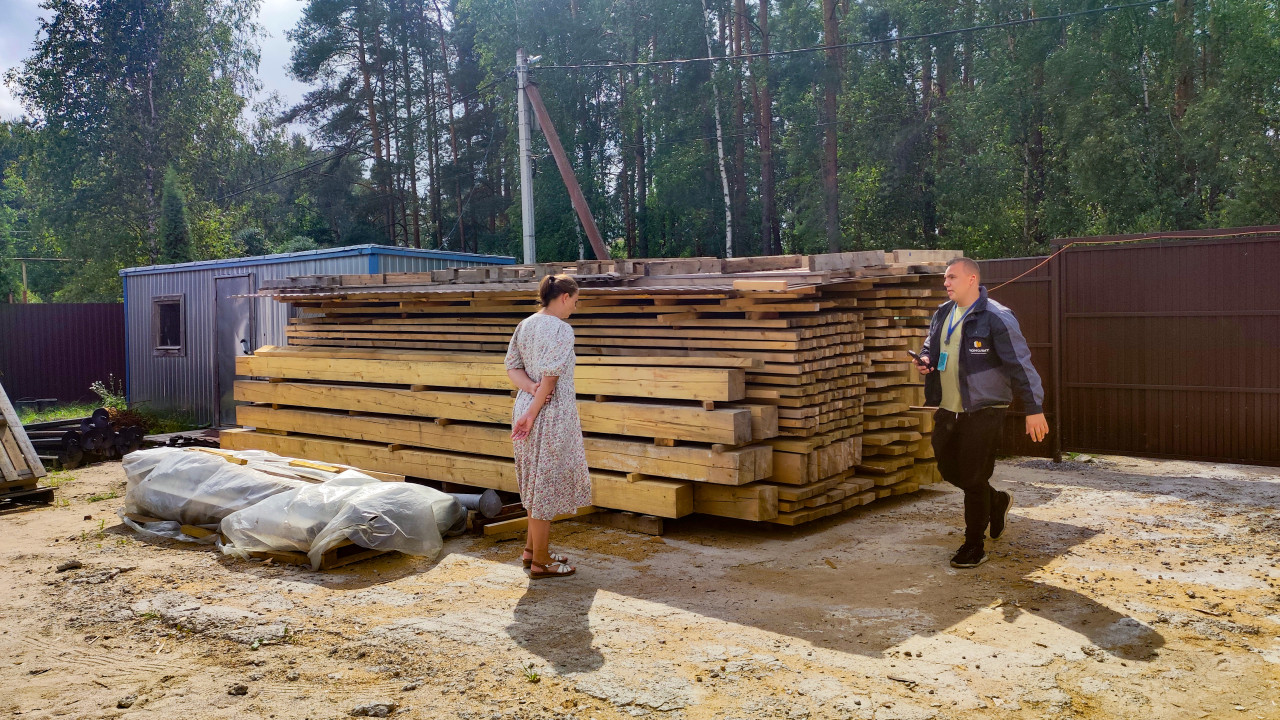 Осмотр штабеля пиломатериалов на строительной площадке у забора и бытовки
