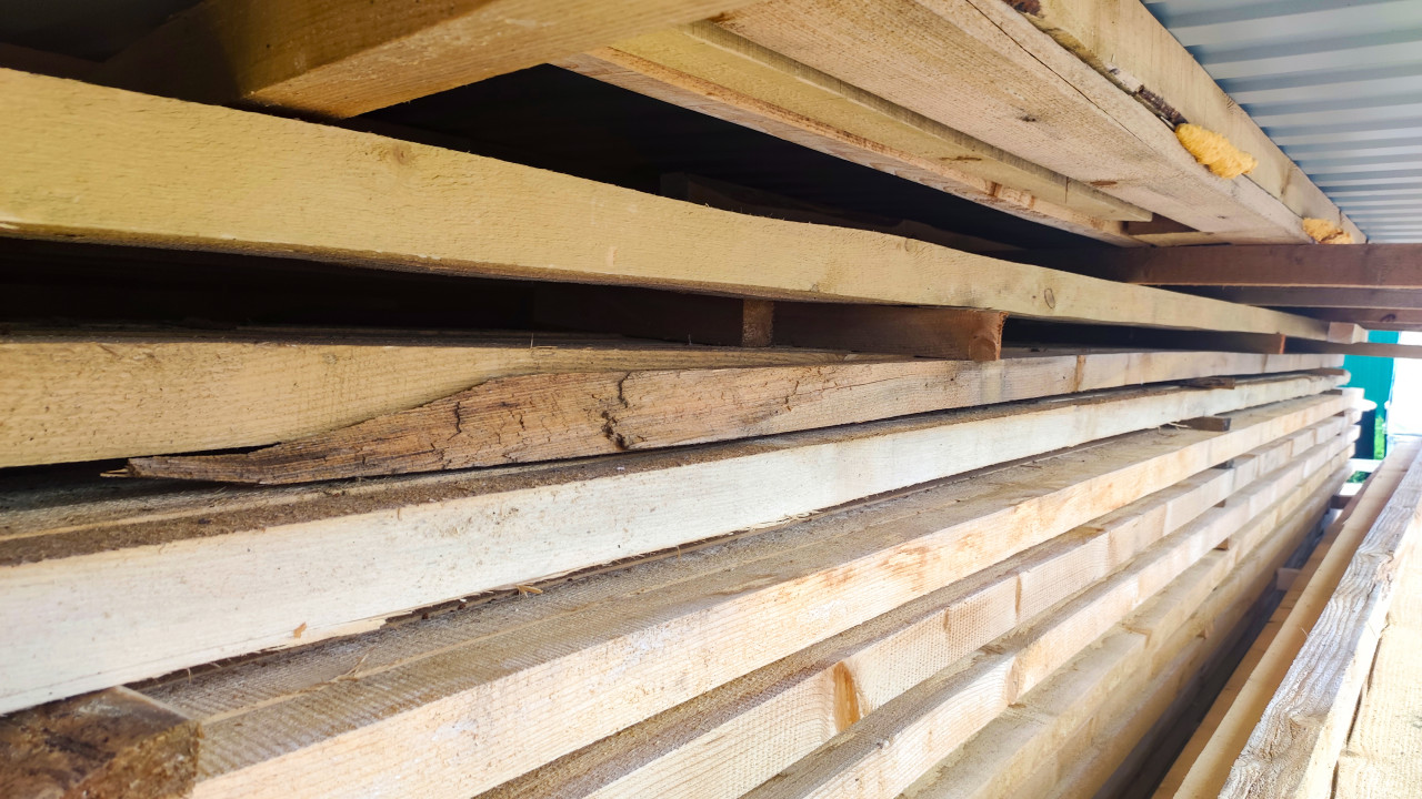 Узел соединения красных деревянных балок под временным тентом