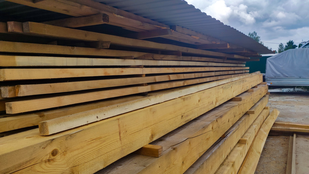 Складированные доски под новой крышей