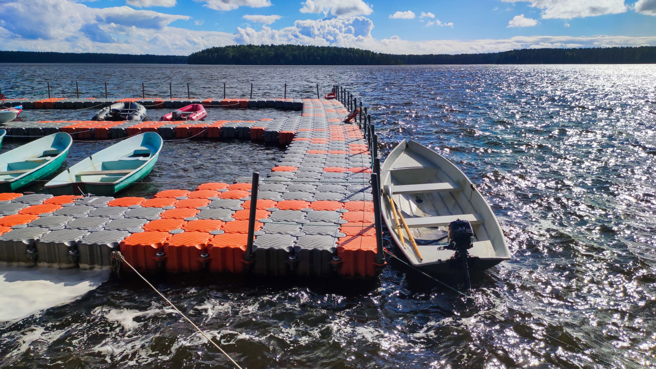 Гребные лодки у понтонного причала