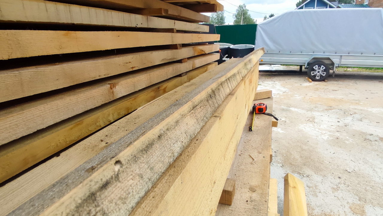 Деревянная балка с выступающими гвоздями под уложенным утеплителем