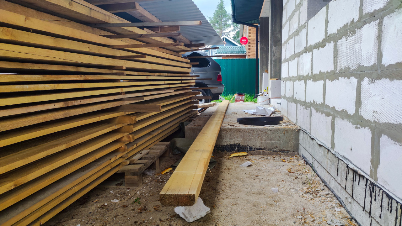 Фронтон деревянного дома с незавершенной подшивкой и оконными проемами