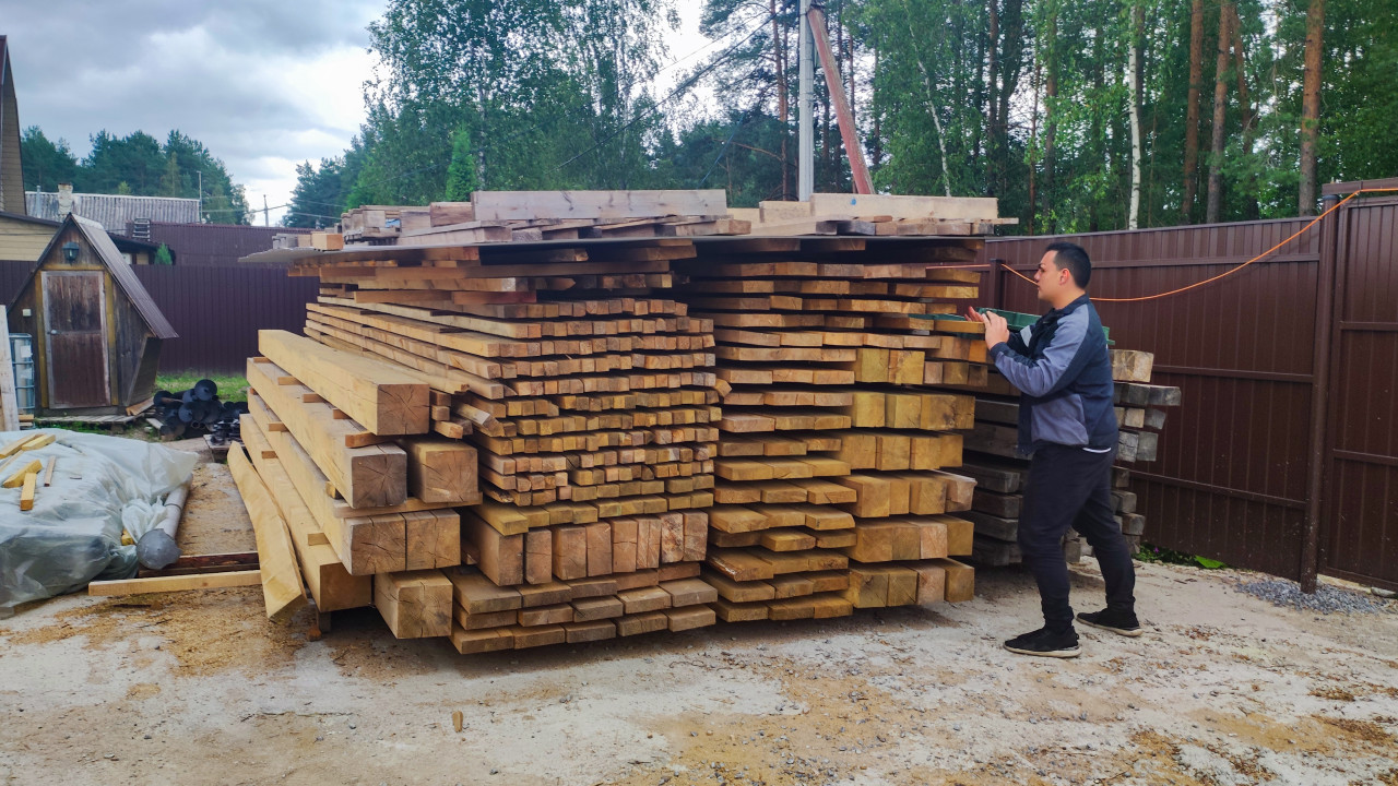 Штабель пиломатериалов под настилом лесов на крыше во время ремонта