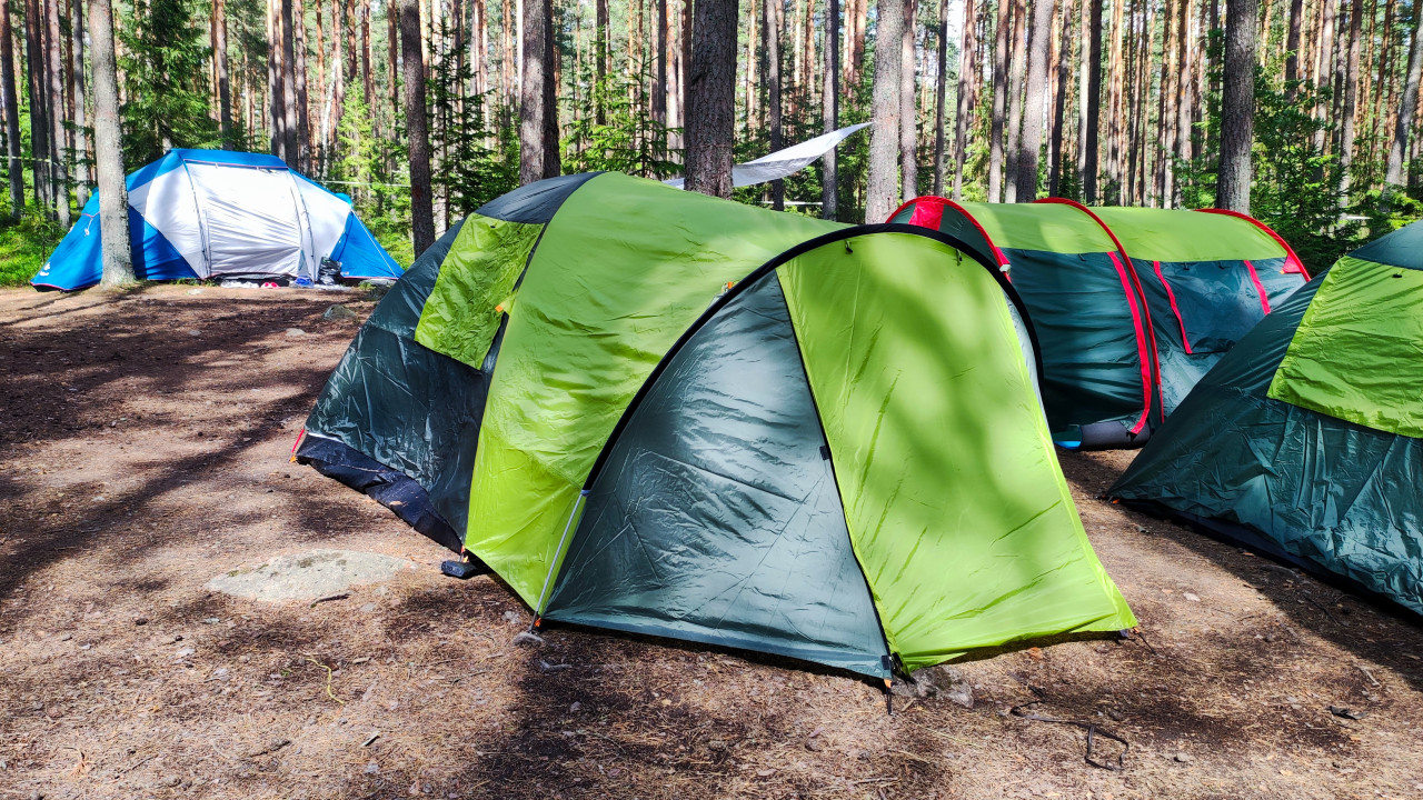 Палатки в лесу на фоне высоких сосен во время кемпинга