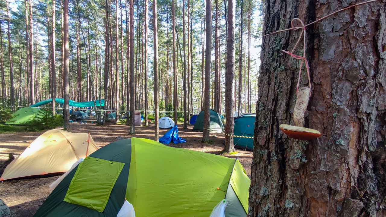 Палатки в лесу на фоне высоких сосен во время кемпинга