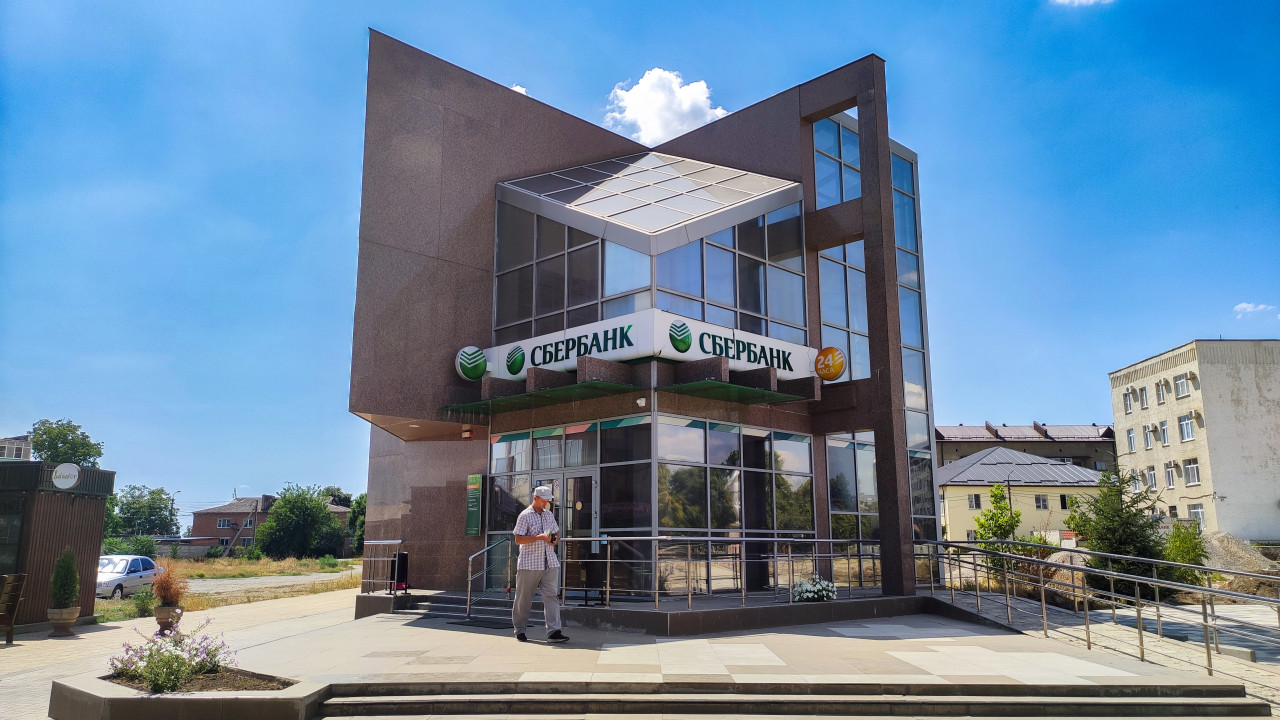 город архитектура современное здание отделение банка банк сбербанк sberbank вывеска логотип стеклянный фасад панорамные окна вход пандус перила летний день офис банка Сбербанк Sberbank 24 часа круглосуточно входная группа двери ступени доступная среда благоустройство тротуар плитка прохожий мужчина голубое небо облакаПохожие фотографии