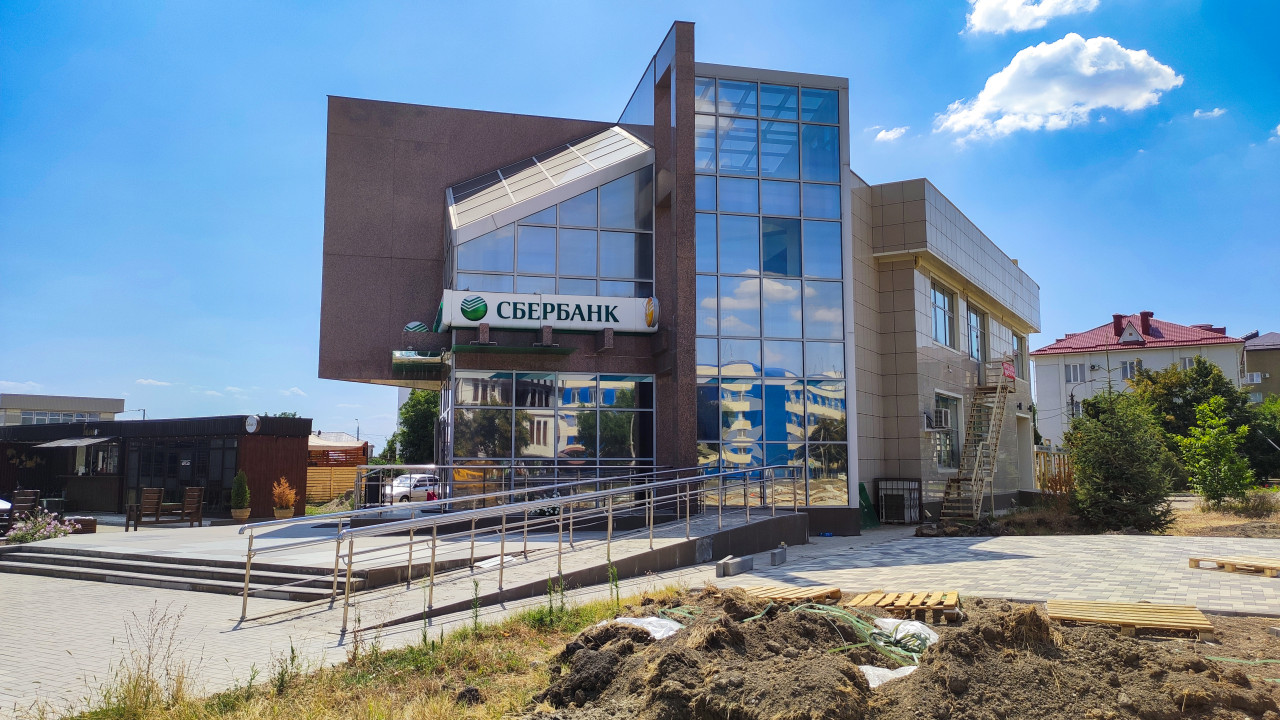 Современное отделение Сбербанка со стеклянным фасадом и пандусом