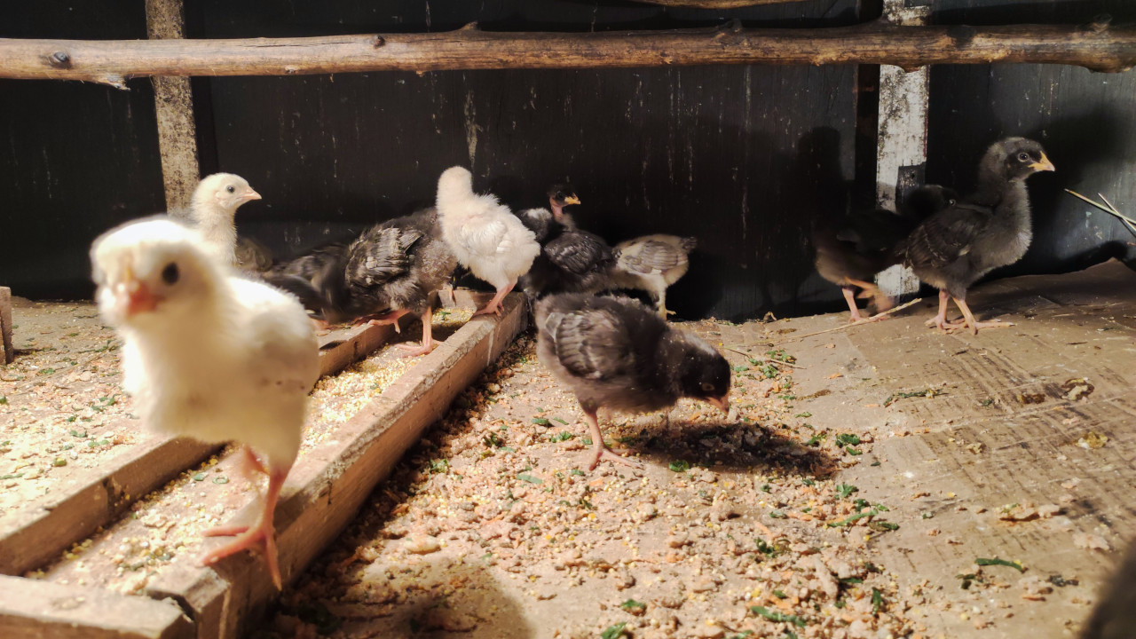 животные птицы домашняя птица цыплята молодняк птицеводство фермерство сельское хозяйство домашнее хозяйство курятник птичник брудер содержание птицы уход за птицей кормление птенцы подворье кормушка зерно комбикорм стая выводок выращивание глубина резкости размытый передний план белый цыпленок темные цыплята деревянные доски насест опилки крошки корма сельская жизнь животноводствоПохожие фотографии