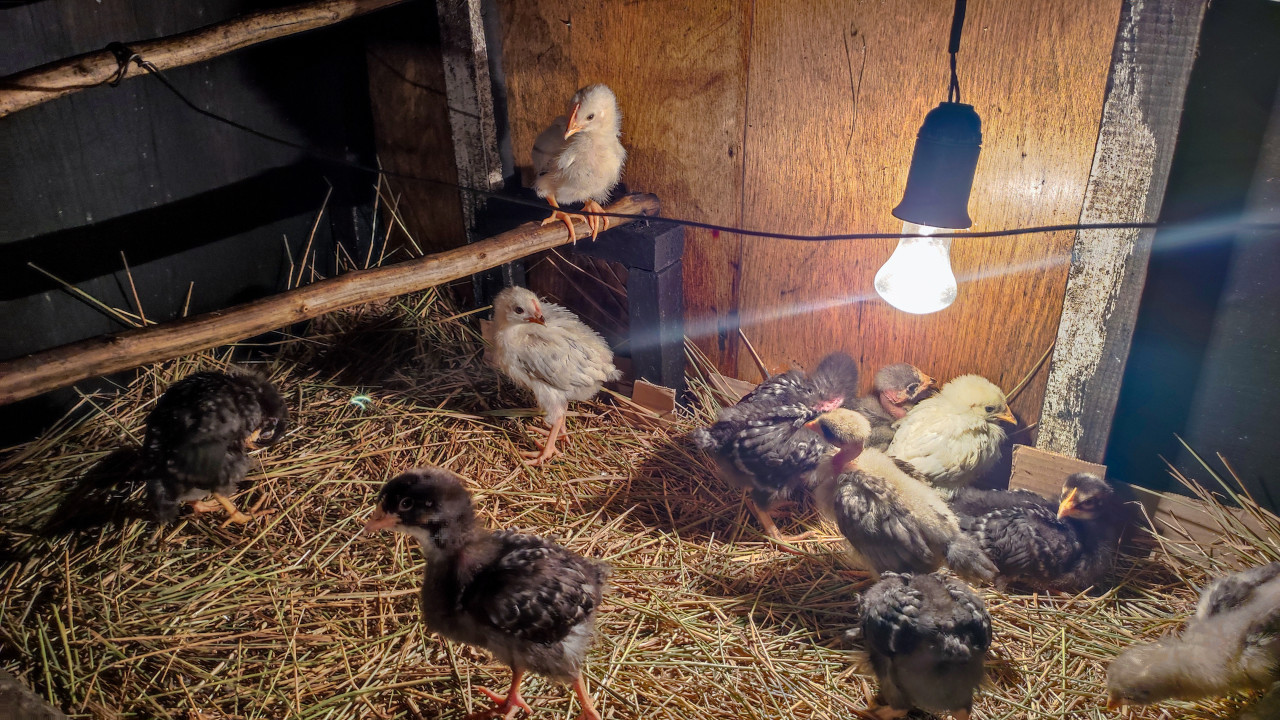животные птицы домашняя птица цыплята молодняк птицеводство фермерство сельское хозяйство домашнее хозяйство курятник птичник брудер содержание птицы уход за птицей кормление курица уход за животными подстилка солома сено деревянные стены жердочки лампа накаливания обогрев теплый свет группа птиц черные цыплята белые цыплята интерьер сараяПохожие фотографии