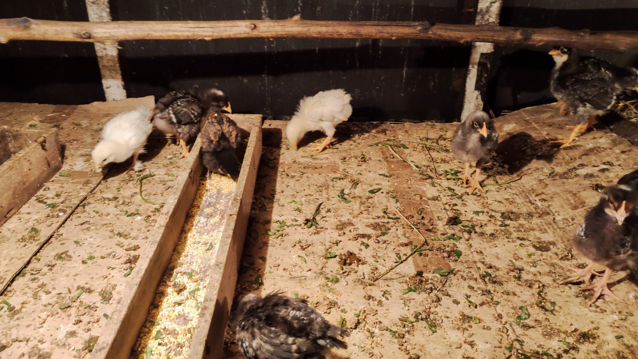 животные птицы домашняя птица цыплята молодняк птицеводство фермерство сельское хозяйство домашнее хозяйство курятник птичник брудер содержание птицы уход за птицей кормление кормушка зерно комбикорм зелень деревянный пол доски жердочки групповая сцена белые цыплята серые цыплята черные цыплята клевание питание сельский бытПохожие фотографии