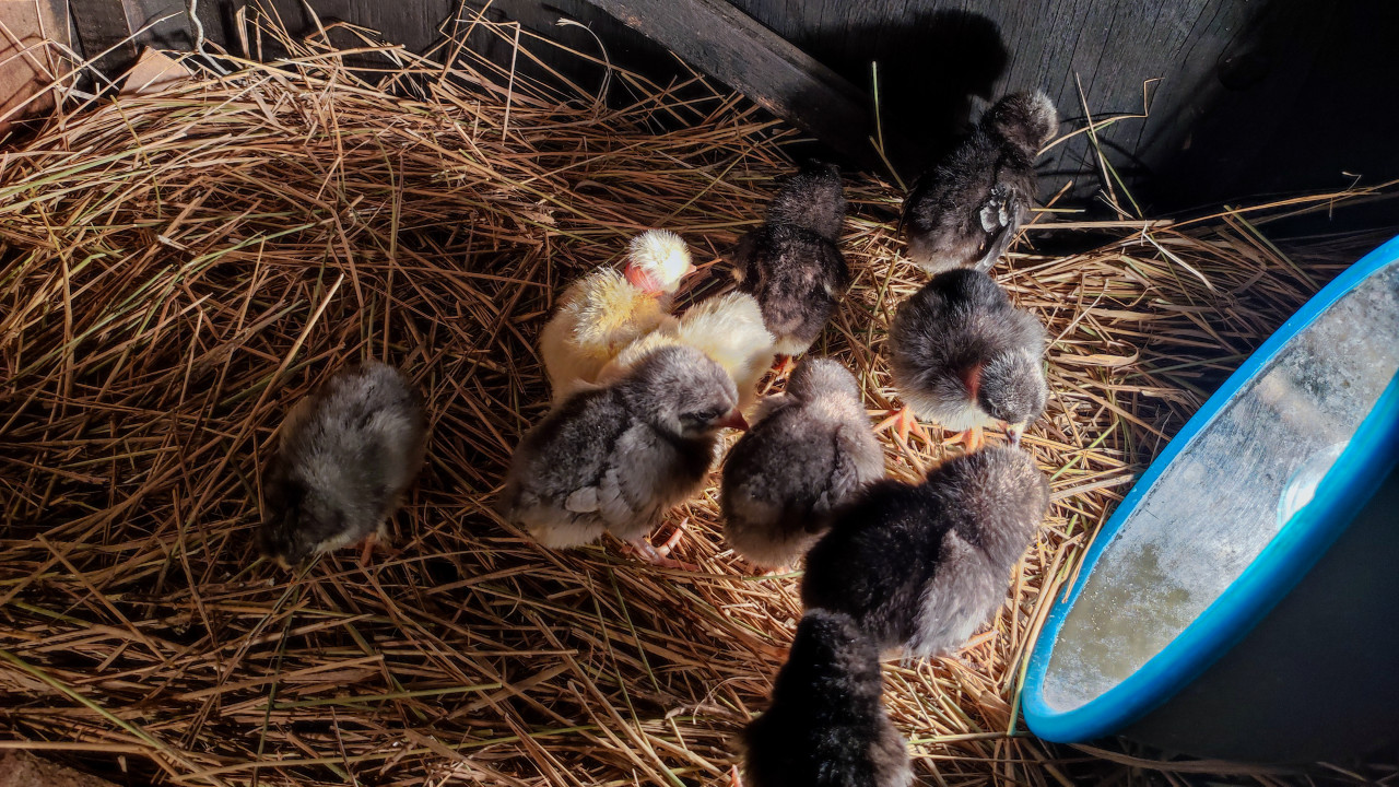 животные птицы домашняя птица цыплята молодняк птицеводство фермерство сельское хозяйство домашнее хозяйство курятник птичник брудер содержание птицы уход за птицей кормление птенцы уход за животными выращивание цыплят подстилка сено солома корм лампа синяя лампа обогрев освещение тёплый свет интерьер сараяПохожие фотографии